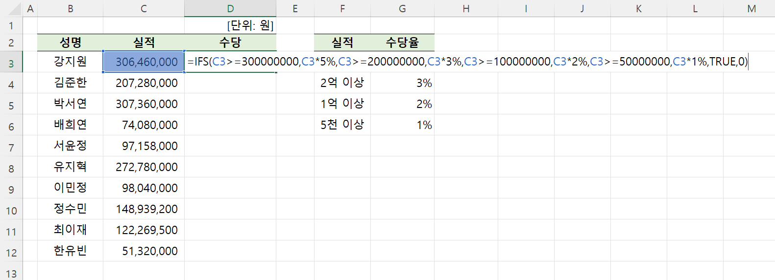 1. [D3] 셀에 =IFS 함수를 입력한 후 괄호를 열고 C3>=300000000(실적이 3억 이상)인지 조건을 작성합니다. 3억 이상이면 쉼표를 입력하고 C3*5%(실적 곱하기 5%)인 참의 결과를 구하는 수식을 작성합니다. IFS 함수는 다중IF와 다르게 IF 함수를 중첩하지 않아도 됩니다.