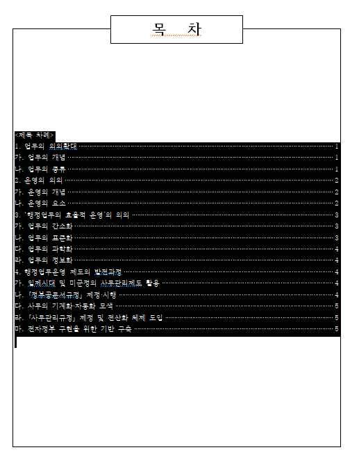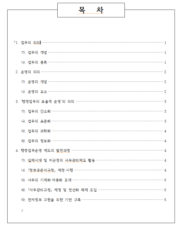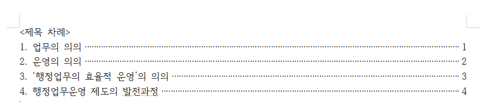 본문을 보면 1수준과 2수준의 문단이 제목 차례에 적합합니다. 물론 더 상세하게 차례를 작성하려면 3수준까지 작성하면 됩니다.