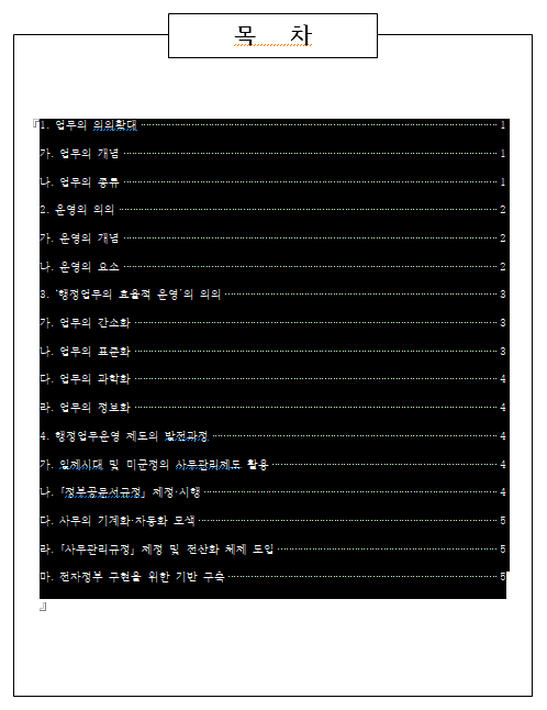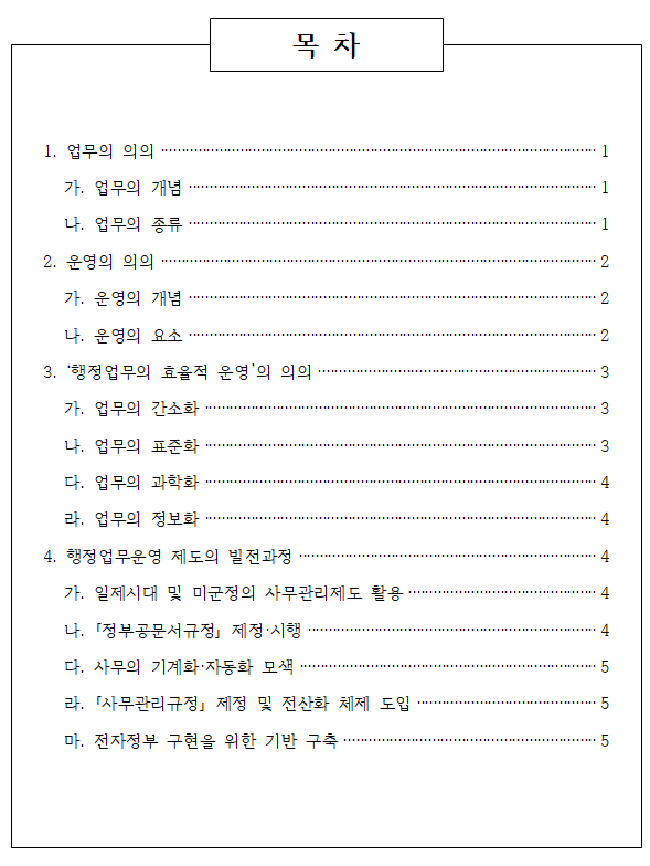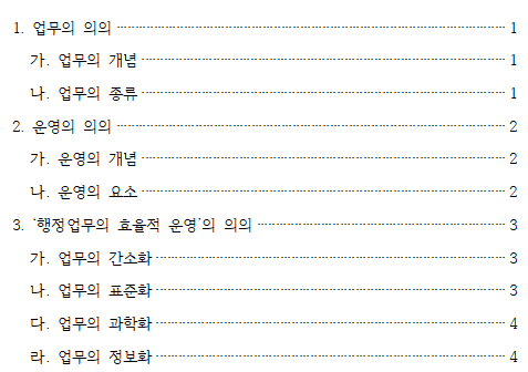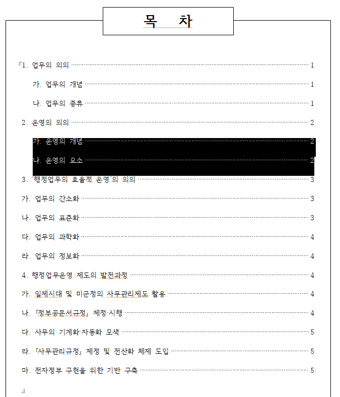 이번에는 아래 예시와 같이 2수준까지 목차를 작성하고 글상자를 사용해 꾸며보겠습니다.
