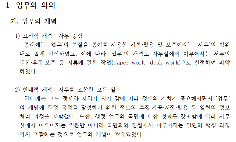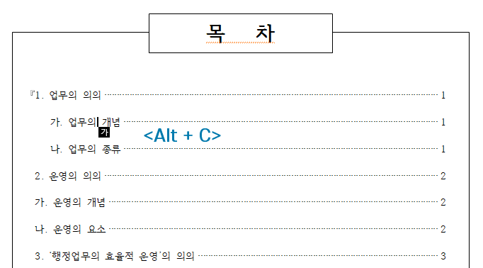 10. 1수준과 2수준이 쉽게 구별이 되죠? 모양 복사를 사용해 나머지 2수준에도 왼쪽 여백을 적용하겠습니다. '가. 업무의 개념'에서 커서를 두고 단축키 <Alt + C>를 눌러 [모양 복사]를 실행합니다.