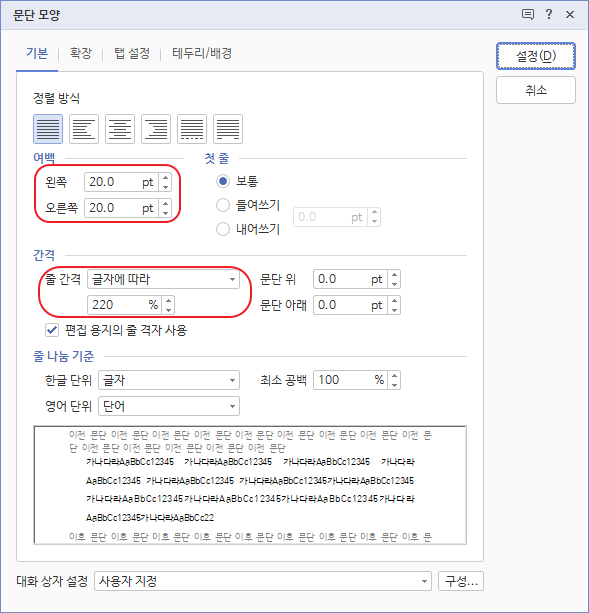 8. 왼쪽, 오른쪽 여백을 20pt로 설정하고 줄 간격은 220%로 변경하고 [설정]을 누릅니다.