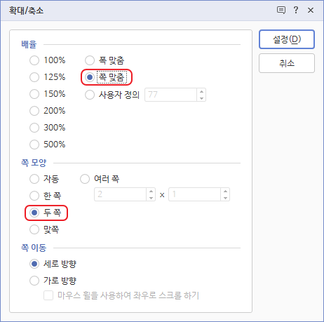 1. 작업이 편하도록 화면 아래 [확대/축소]를 눌러 쪽 전체가 보이도록 배율 '쪽 맞춤', 쪽 모양 '두 쪽'으로 변경합니다.