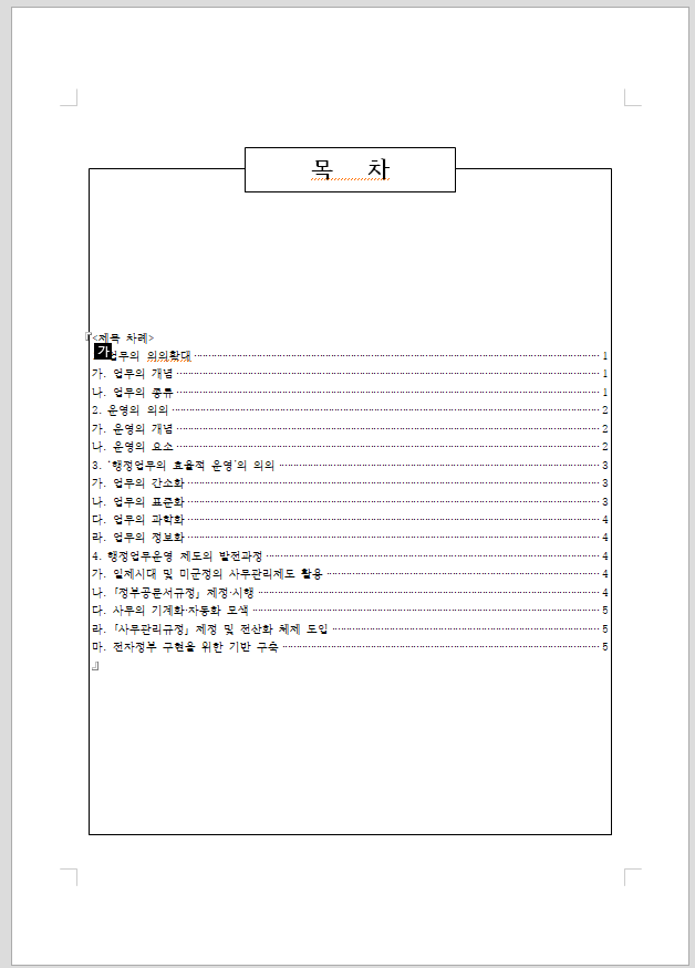 현재 문서에는 쪽 번호가 매겨져 있고, 개요 번호를 사용해 3개 수준으로 문단이 구성되어 있습니다. 그럼 첫 쪽에 목차를 작성해보겠습니다.