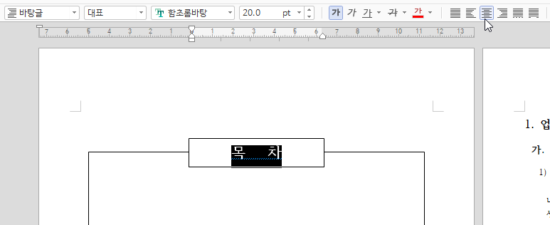 5. 제목 글상자에 '목 차'를 입력한 후 글자 크기 20pt, 진하게, 가운데 정렬합니다.