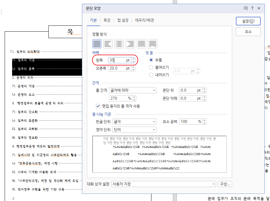 9. 1 수준과 2수준의 가독성을 위해 2 수준의 여백을 35pt로 설정해 조금 더 들여쓰기 하겠습니다. 아래와 같이 2 수준을 블록 지정한 후 <Alt + T>를 눌러 [문단 모양]을 실행합니다. 그런 다음 왼쪽 여백 35pt로 변경하고 [설정]을 누릅니다.