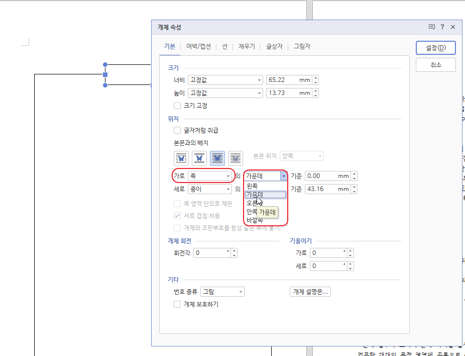 4. 글상자가 쪽의 한쪽으로 치우쳐 작성되면 완성도가 떨어집니다. 그래서 쪽의 가운데로 배치되도록 설정해보겠습니다. 같은 결과를 내는 방법은 많지만 개체 속성 상자에서 위치를 가운데 배치하는 방법을 소개하겠습니다.