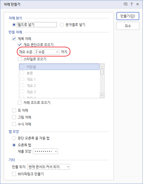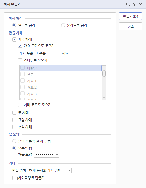 2. 제목 차례와 개요 문단으로 모으기에 체크 표시하고 [개요 수준]은 1수준까지로 선택합니다. 그리고 표 차례, 그림 차례, 수식 차례는 체크 표시를 해제합니다. 마지막으로 하이퍼링크 만들기는 체크 표시를 해제합니다.
