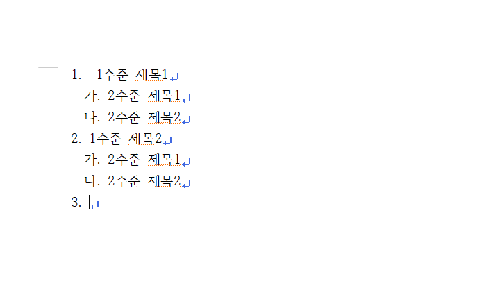 다시 한 번 <Ctrl + Num 더하기(+)>를 누르면 ‘3수준’ 번호, ‘4수준’ 번호로 낮춰지고, 최대 ‘10수준’까지 나타낼 수 있습니다.