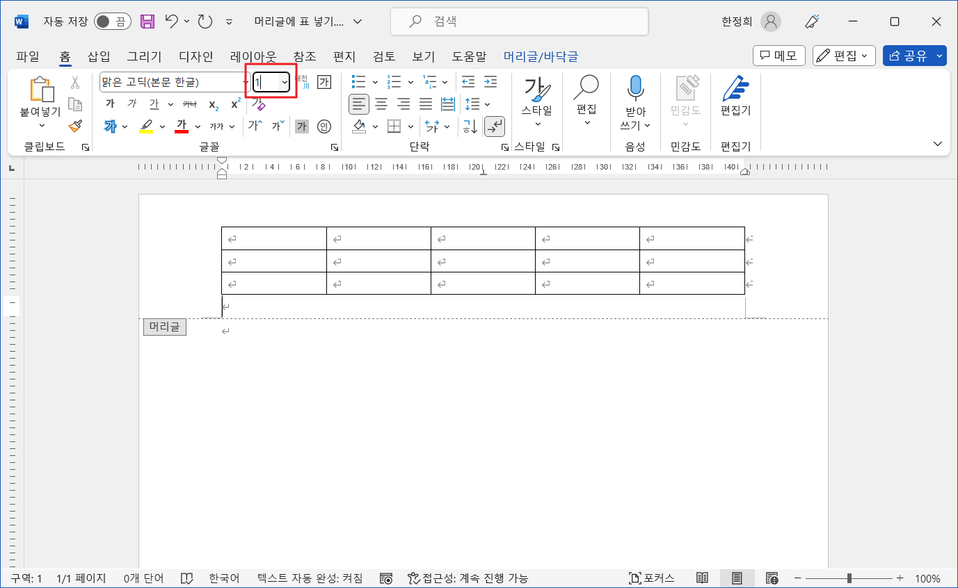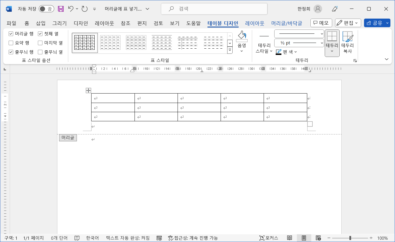 그런데 머리글에 표를 삽입하면 이 빈 줄이 공간을 차지합니다.