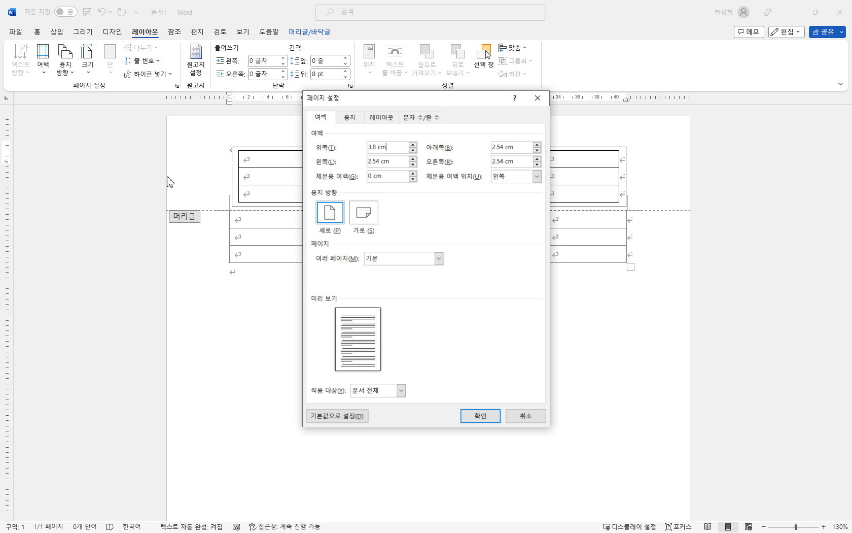 먼저 머리글이 나타날 위치를 1cm으로 변경합니다.