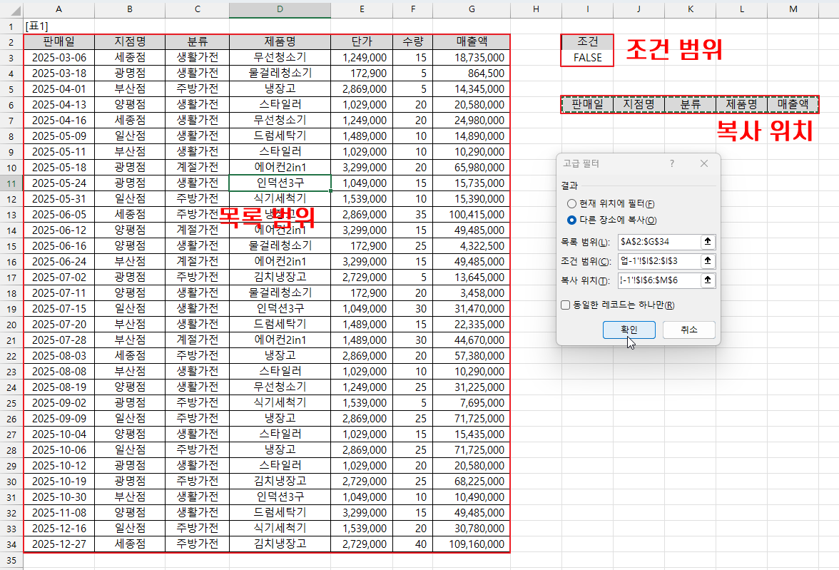 4. [표1]에서 임의의 셀을 선택하고 [데이터] 탭 - [정렬 및 필터] 그룹 - [고급]을 선택합니다. 그러면 목록 범위는 자동으로 입력됩니다. 조건 범위에는 [I2:I3] 셀 범위를 지정하고 다른 장소에 복사를 선택한 후 복사 위치에는 [I6:M6] 셀 범위를 지정하고 [확인]을 누릅니다.