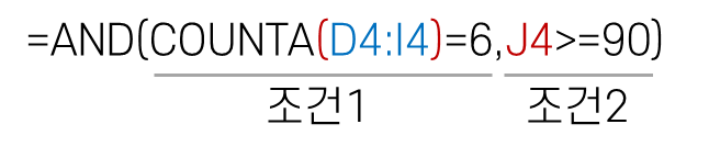 조건1: 비어 있지 않은 셀의 개수를 구하는 COUNTA( 함수를 중첩한 후 [D4:I4] 셀 범위를 인수로 지정합니다. 그러면 'O'가 입력된 셀의 개수를 구해 6과 같은지 비교합니다.(출석일수는 모두 6일이어야 합니다.)