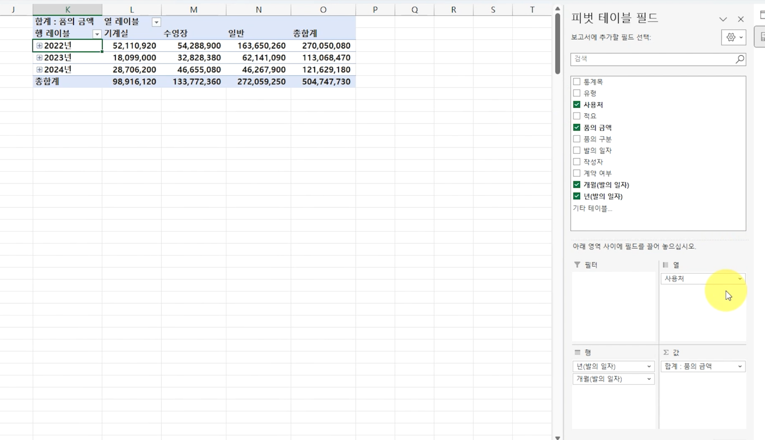 이번에는 '사용처'를 열 영역으로 추가하면 연도별, 사용처별로 품의 금액을 나타내는 피벗 테이블이 작성됩니다.