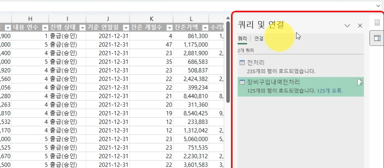 왼쪽 [쿼리] 창에서 '표4' 쿼리를 더블클릭해 '장비구입내역전처리'로 이름을 변경합니다. 그러면 기존 시트 이름과 구분할 수 있습니다.
