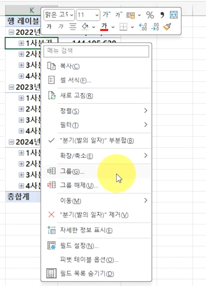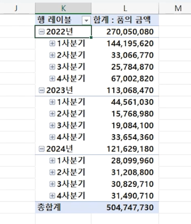 각 연도에서 마우스 오른쪽 버튼을 눌러 [전체 필드 확장]을 누르면 연도별, 분기별 품의 금액의 합계를 단계별로 확인할 수 있습니다.