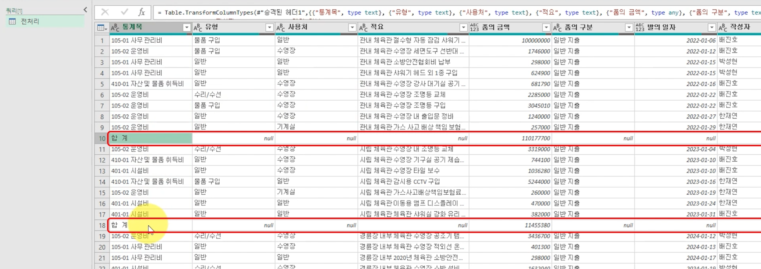 왼쪽에 [쿼리] 창을 보면 '시설 운영비' 쿼리가 생성되어 있습니다.
