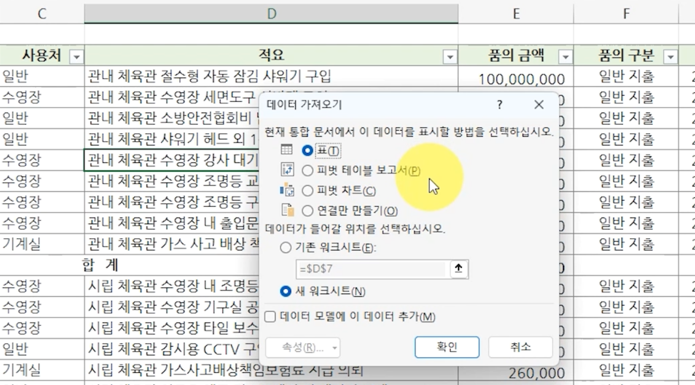 워크시트로 데이터를 가져오는 방법 중 '표' 또는 '피벗 테이블 보고서' 등으로 선택할 수 있습니다.
