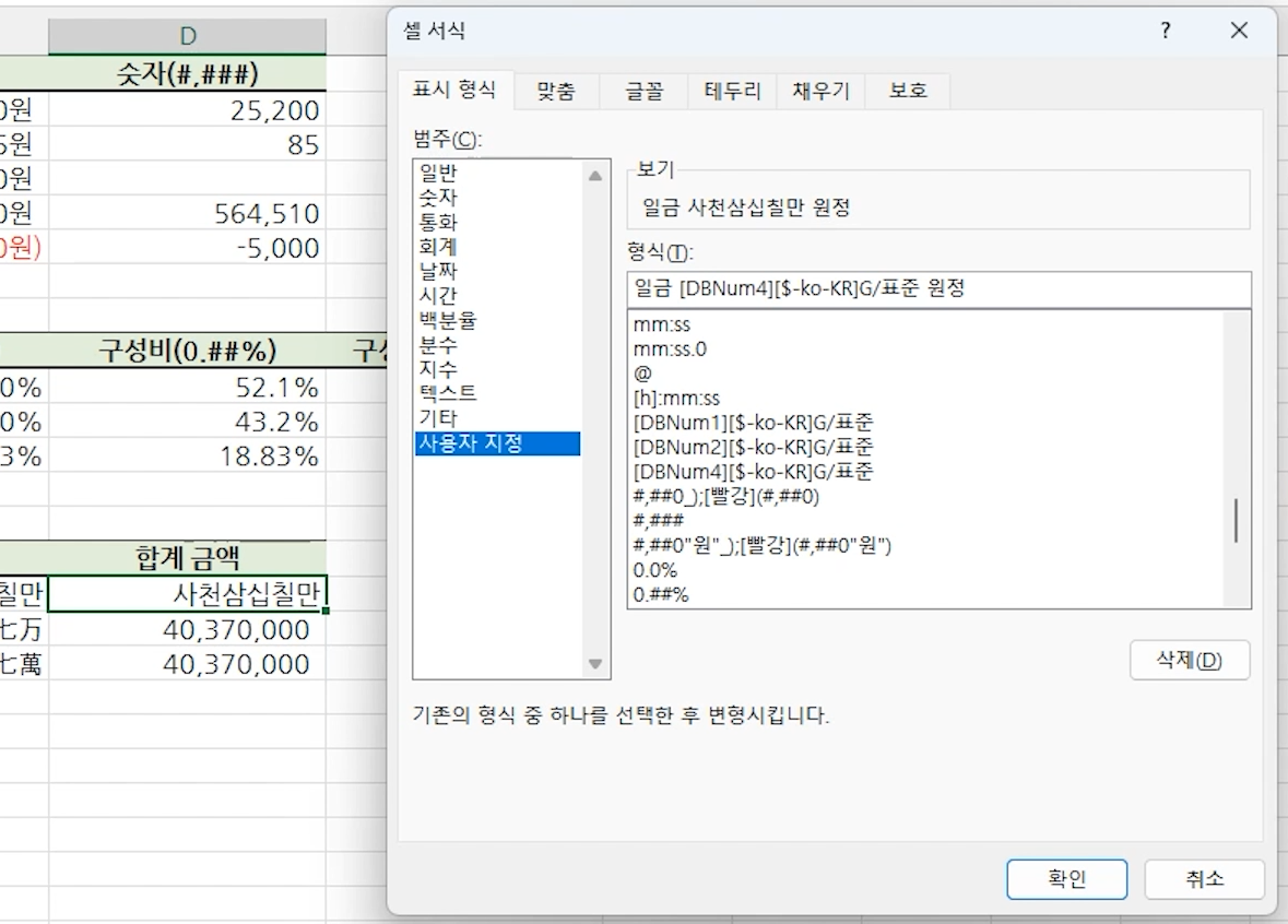 2. 다시 [D16] 셀을 선택하고 [셀 서식]을 실행한 후 '사용자 지정' 범주를 선택합니다. 대괄호 속에 [DBNum]이라고 되어 있는 서식 기호 앞에 '일금'을 입력하고 마지막에 '원정'을 입력합니다.