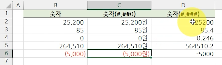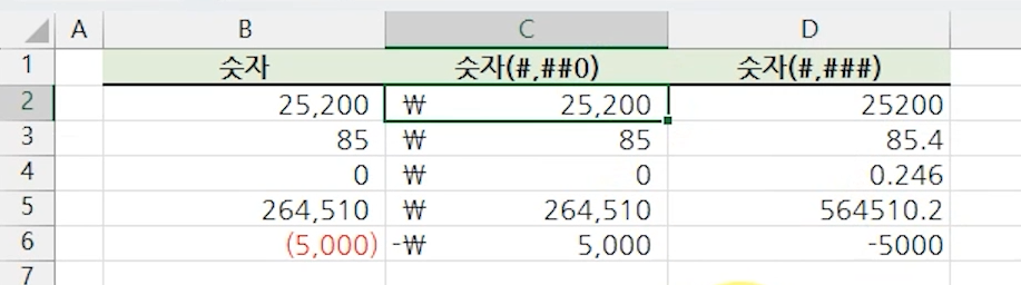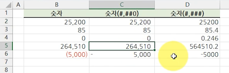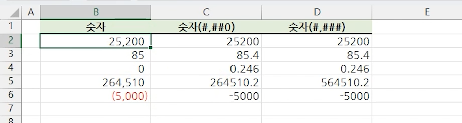 그랬더니 천 단위마다 쉼표가 표시되었죠? 음수는 괄호 속에 빨간색 글꼴로 표시됩니다.