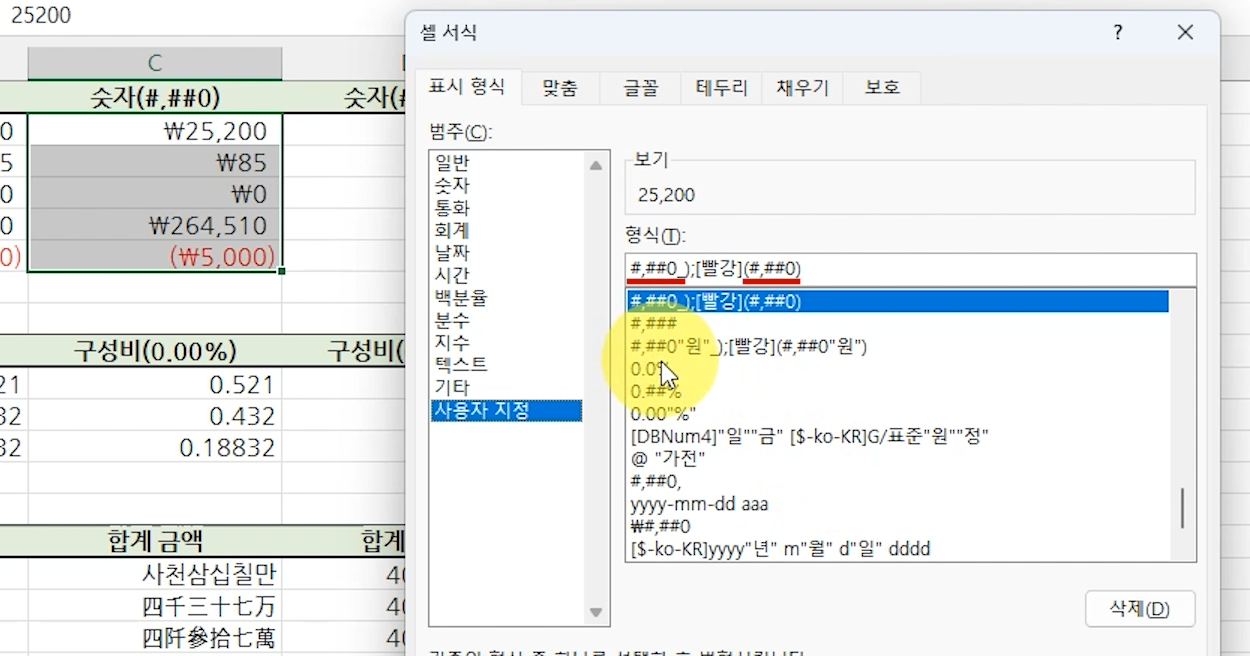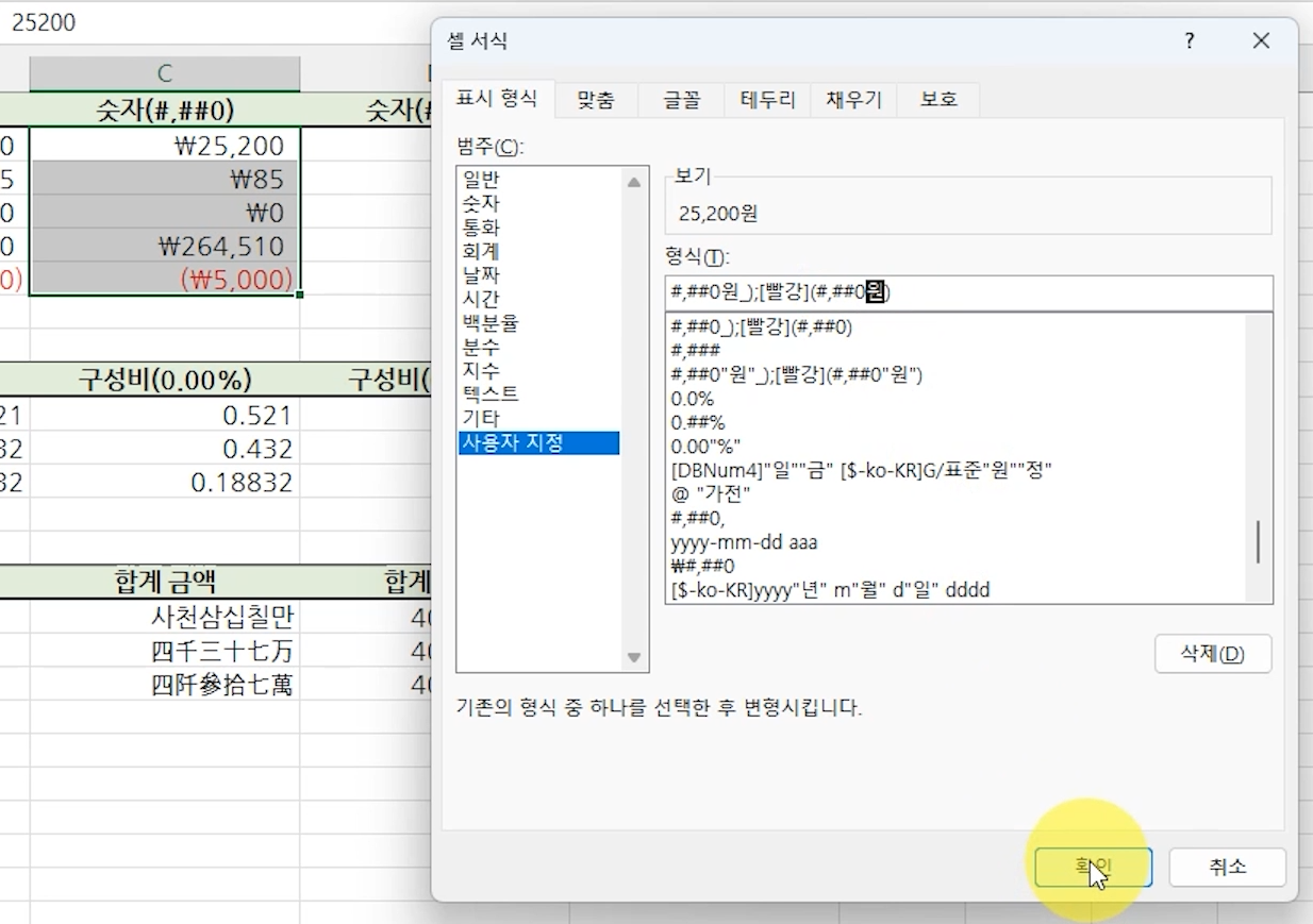 7. '사용자 지정' 범주를 선택합니다. #,##0은 1000 단위마다 쉼표를 표시하는 형식이 됩니다. 사용자 지정 범주에서 표시 형식을 설정하는 법을 알아두면 숫자, 통화, 회계 범주에서 표시할 수 없는 사용자가 원하는 표시 형식을 지정할 수 있습니다.