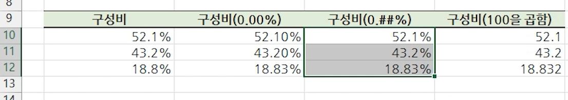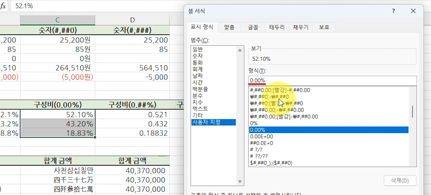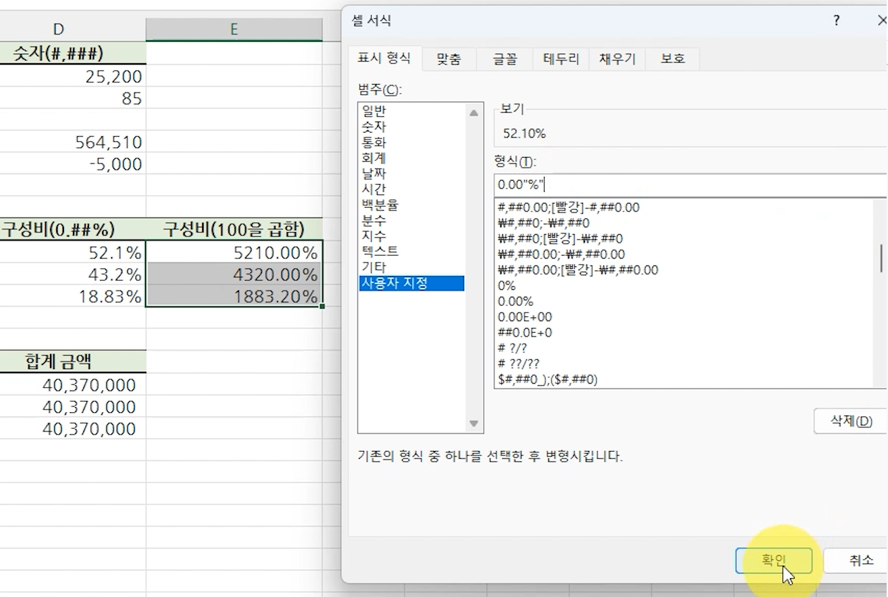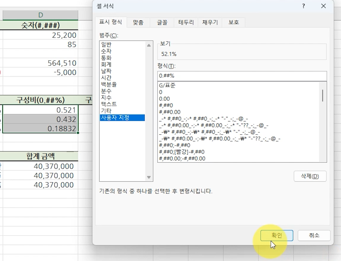 3. [확인]을 누르고 이번에는 [D] 열의 구성비 범위를 선택합니다. 그리고 [셀 서식]을 실행하고 '사용자 지정' 범주를 선택합니다. 형식에 0.##%를 입력하고 [확인]을 누릅니다.