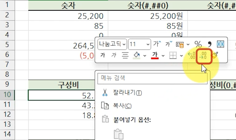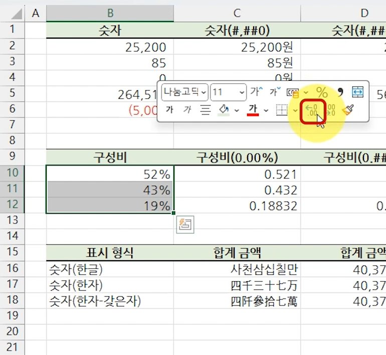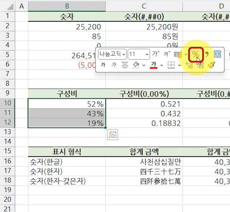 10. 이번에는 [B]의 구성비 범위를 선택합니다. 마우스 오른쪽 버튼을 눌러 [백분율] 스타일을 적용하고 [자릿수 늘림]을 한 번 눌러 소수 첫째 자리까지 나타냅니다.