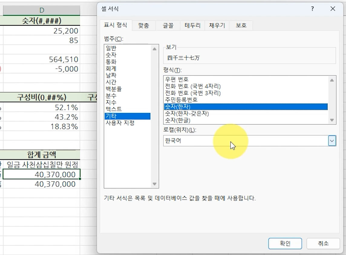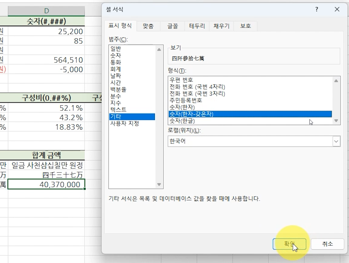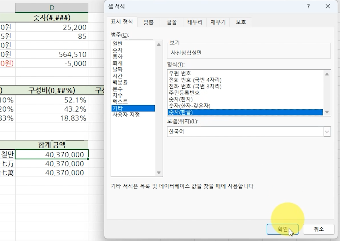 4. [D18] 셀을 선택하고 [셀 서식]을 실행합니다. '기타' 범주를 선택한 후 이번에는 숫자(한자-갖은자)를 선택하고 [확인]을 누릅니다.