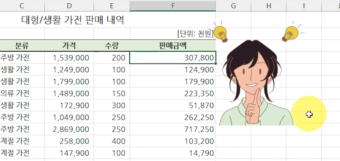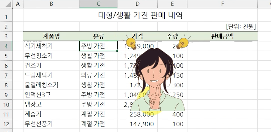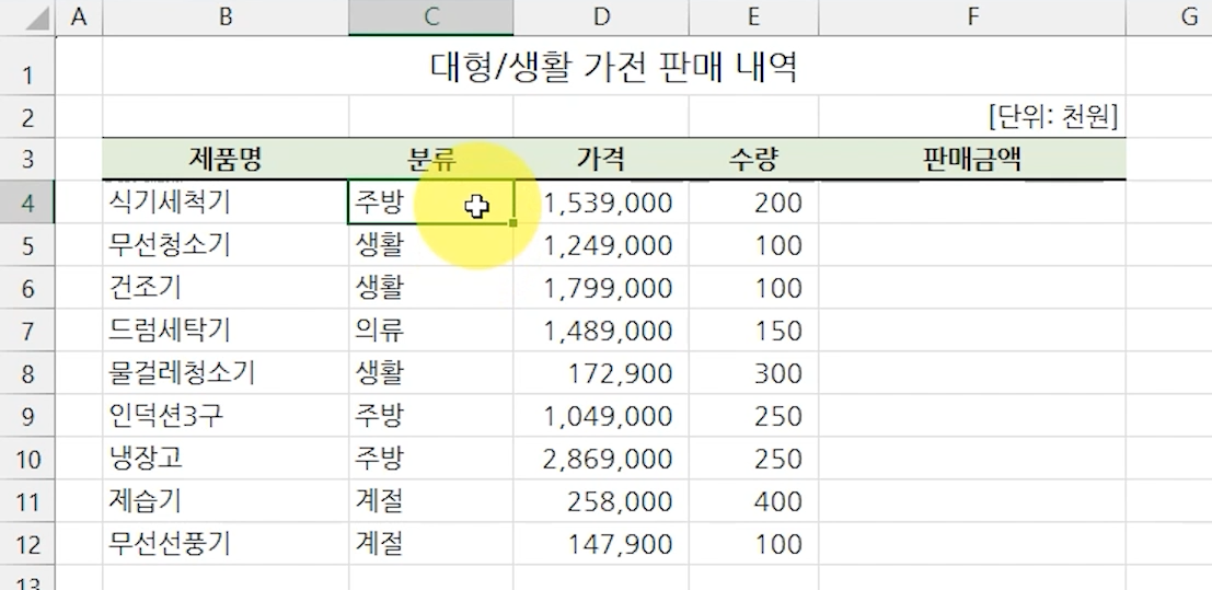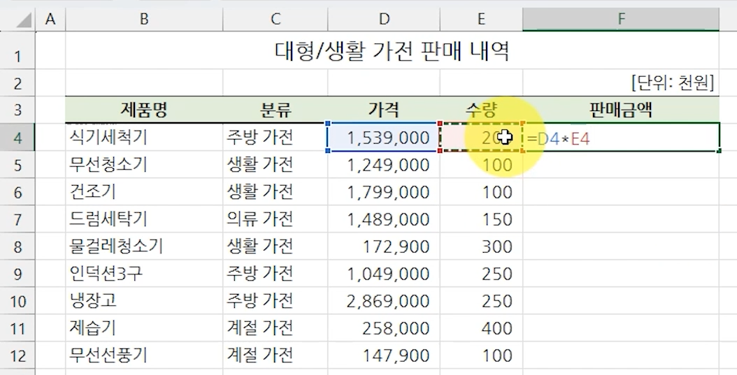 3. 이번에는 가격과 수량을 곱해 판매금액을 구합니다.