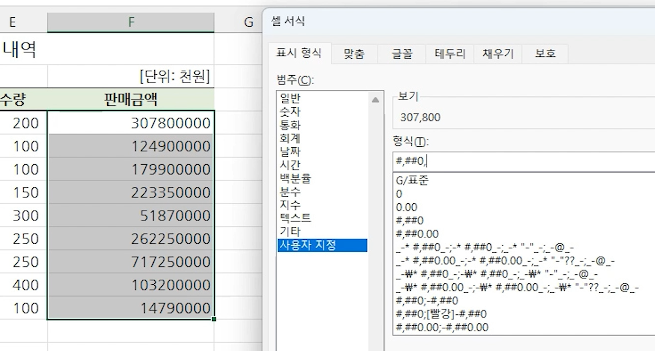 4. 이렇게 구한 판매금액 범위를 선택하고 [셀 서식]을 실행합니다. '사용자 지정' 범주를 선택하고 #,##0 그리고 ,(쉼표)를 입력합니다. 마지막에 입력한 ,(쉼표)는 천 단위를 생략하는 쉼표입니다.