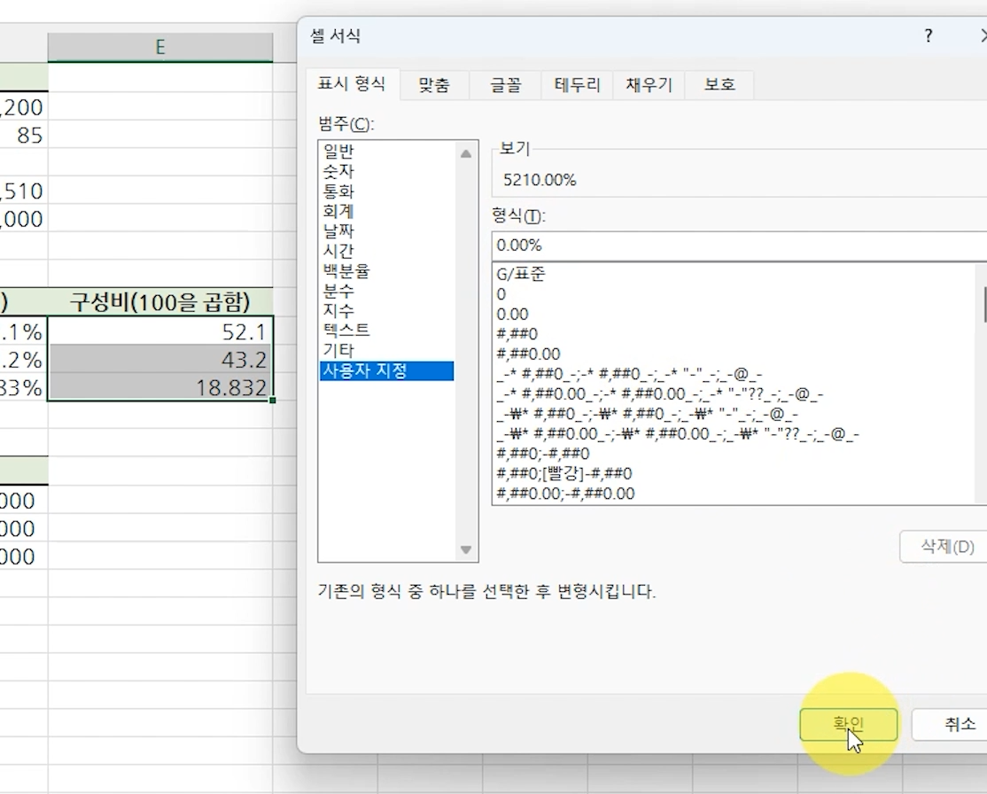 4. [E] 열의 구성비는 금액에 100을 곱해 구한 것으로, % 기호를 붙여 백분율로 표시해 보겠습니다. [E] 열의 구성비 범위를 선택하고 [셀 서식]을 실행합니다. 그리고 '사용자 지정' 범주를 선택하고 형식을 0.00 %로 입력합니다.