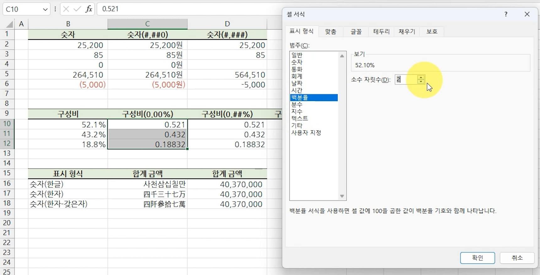 1. [B] 열의 구성비 범위를 선택하고 [셀 서식]을 실행합니다. '백분율' 범주를 선택하고 소수 자릿수 2를 입력합니다. [확인]을 누르면 52.1%가 52.10%로 표시됩니다.