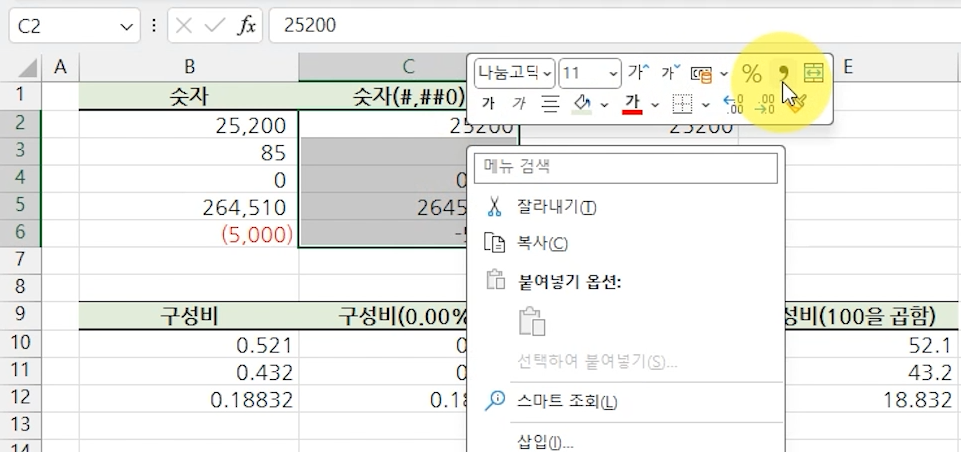 3. 이번에는 [C] 열의 숫자 범위를 선택하고 마우스 오른쪽 버튼을 눌러 [쉼표 스타일]을 적용합니다. 천 단위마다 쉼표가 표시됩니다.