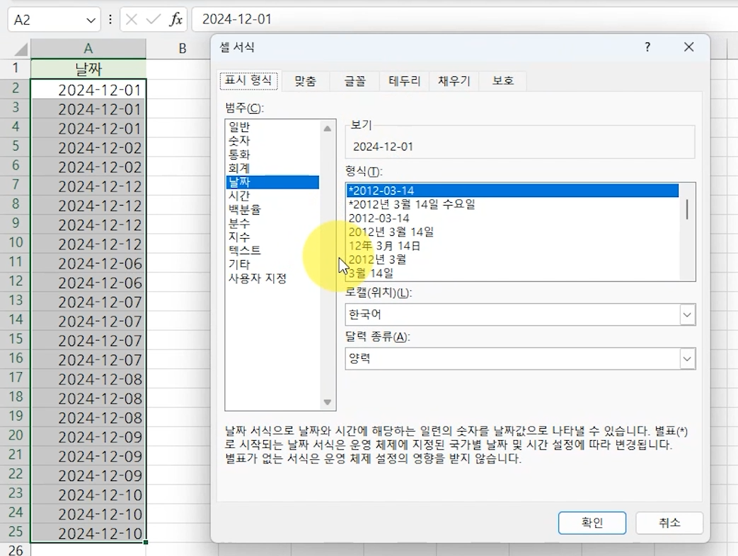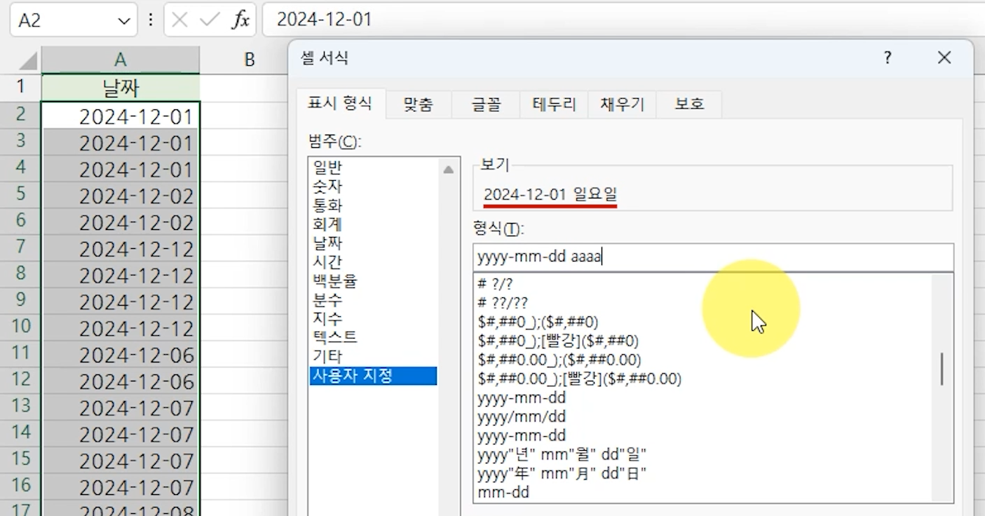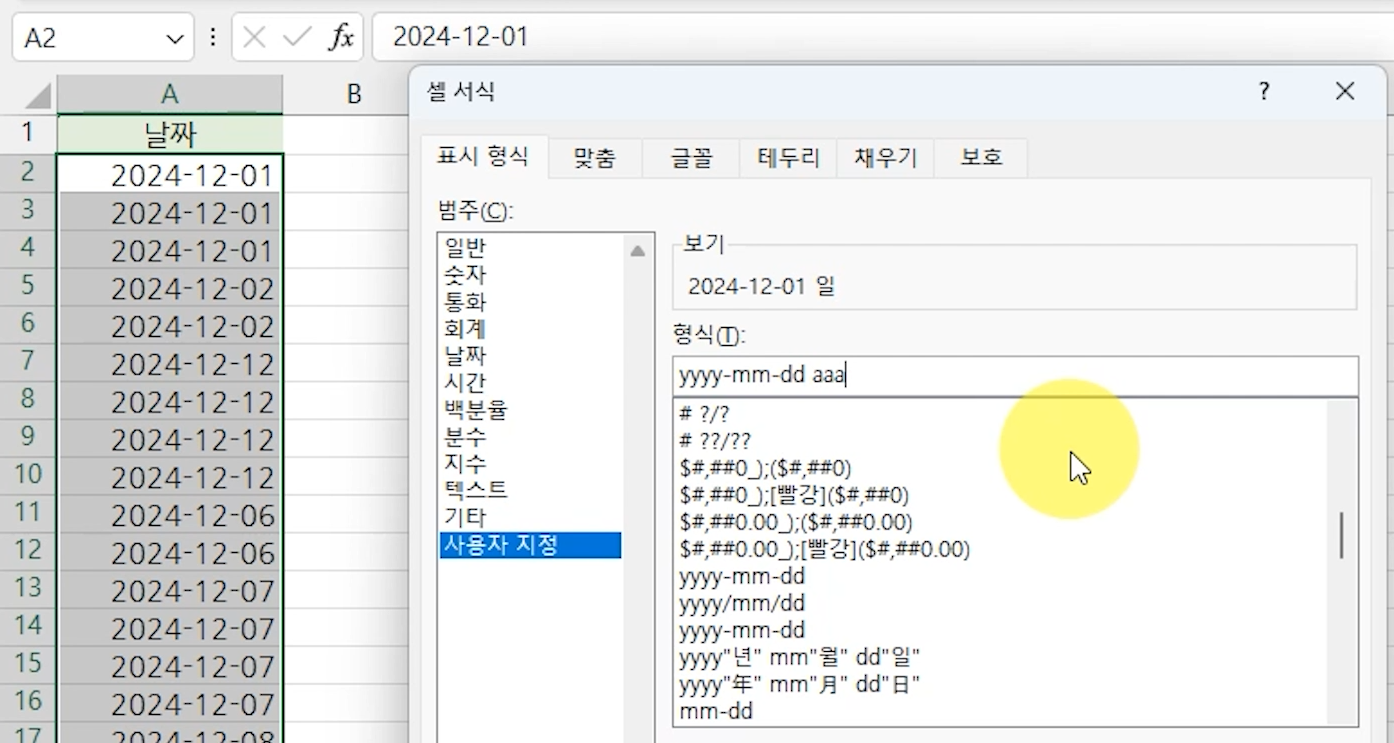 2. 연-월-일로 표시되는 형식을 선택하고 '사용자 지정' 범주를 선택합니다. yyyy-mm-dd가 연-월-일을 표시하는 날짜 서식이고 그 뒤에 a를 4번 입력합니다. 날짜 뒤에 요일이 표시됩니다.