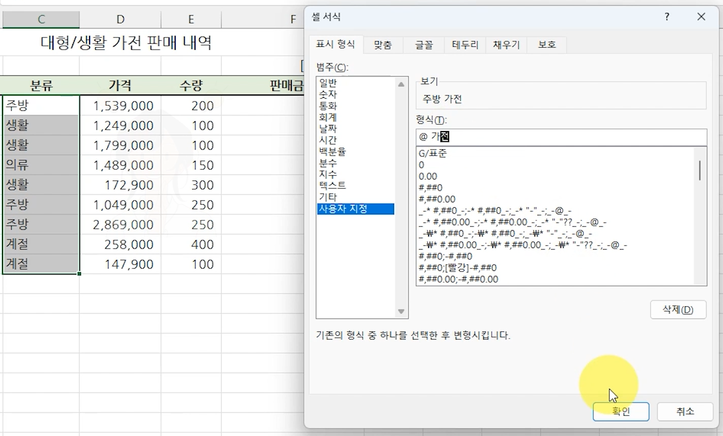 2. 분류 범위를 선택하고 [셀 서식]을 실행합니다. '사용자 지정' 범주를 선택한 후 형식 입력창에 @을 입력하고 한 칸을 띄어 쓴 후 '가전'을 입력합니다.