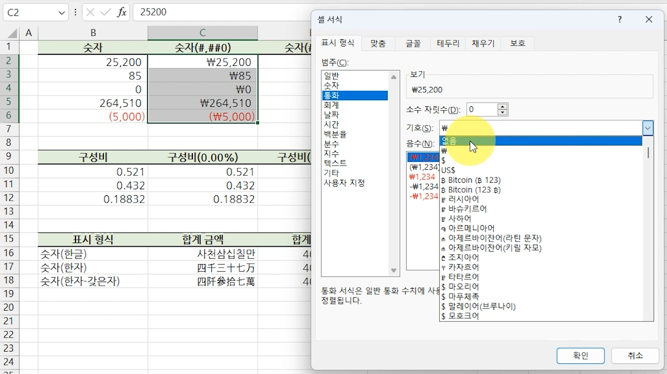 6. 다시 [셀 서식]을 실행합니다. 기호를 '없음'으로 설정합니다.