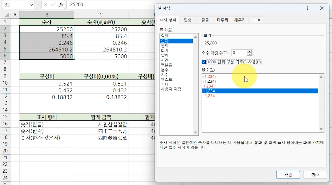 2. '숫자' 범주를 선택하고 '1000 단위 구분 기호(,) 사용'에 체크 표시를 합니다. 그리고 음수를 표시하는 첫 번째 형식을 선택하고 [확인]을 누릅니다.