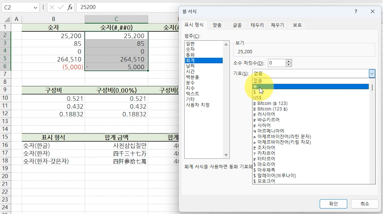 통화 형식은 원화 기호와 숫자가 같은 방향으로 정렬됩니다.