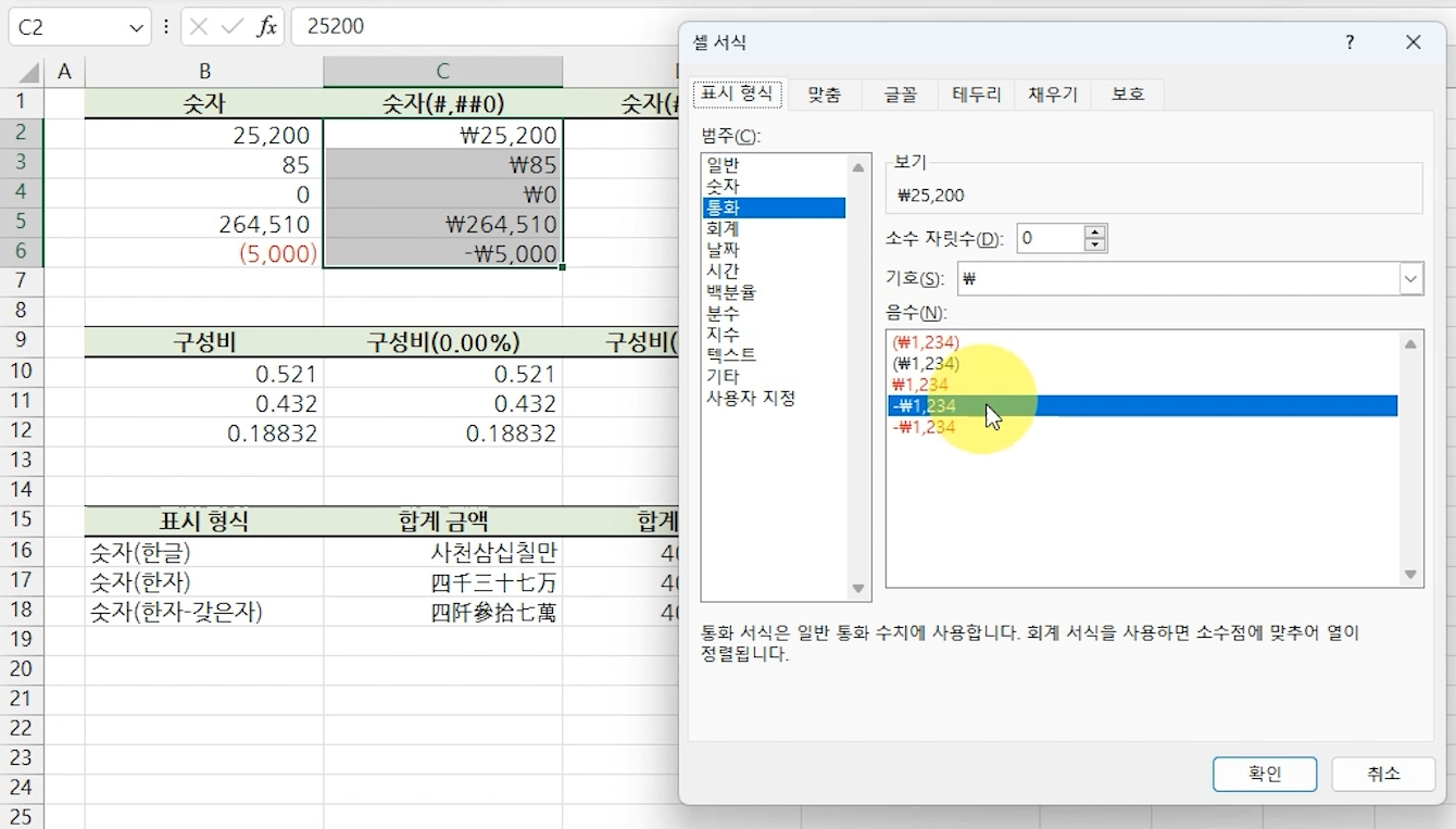 5. 다시 범위를 선택하고 이번에는 '통화' 형식으로 변경합니다. 통화 형식은 회계 형식과 달리 음수 표시 형식을 별도로 지정할 수 있습니다. 괄호 속의 빨간색 음수 표시 형식을 선택하고 [확인]을 누릅니다.