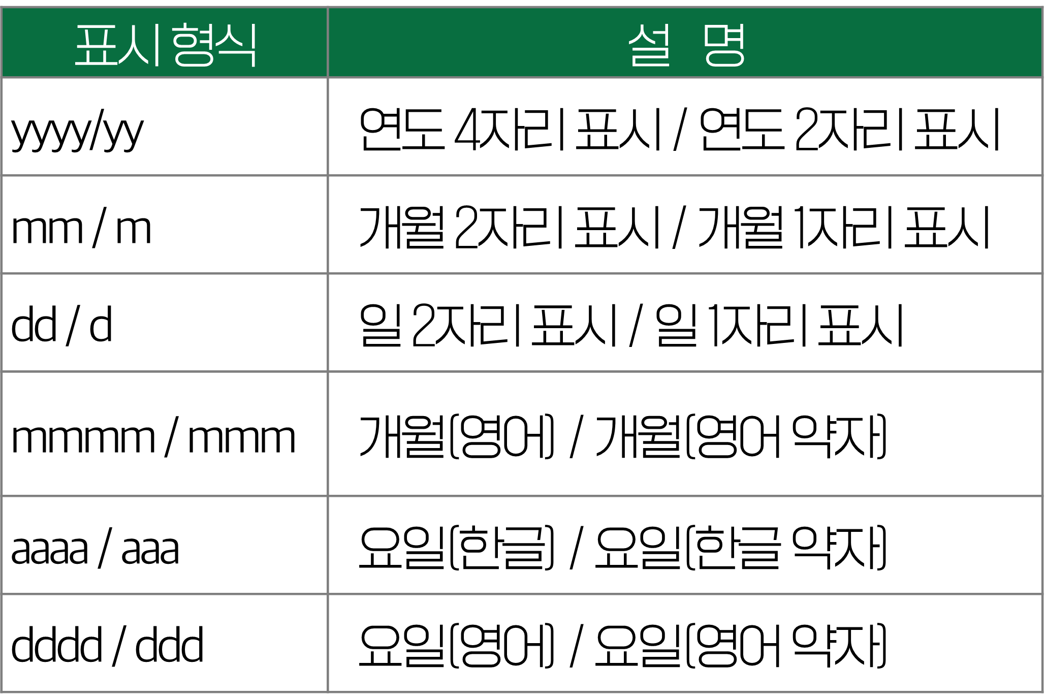 그 외에도 날짜를 다양한 형식으로 표시할 수 있는데 표를 참고해서 직접 형식란에 입력해 보세요。
