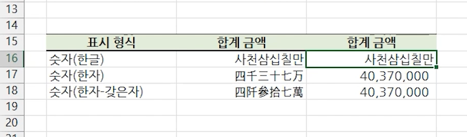 이제 합계 금액을 한자로 표시해 보겠습니다. 한자는 두 가지 형식으로 표시할 수 있습니다.\
