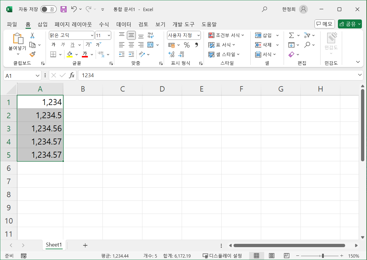 [확인]을 눌러 적용된 결과를 보면 실수는 제대로 처리되었지만 정수인 경우엔 문제가 있습니다.