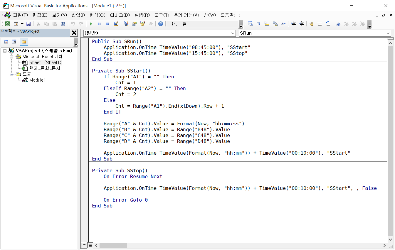 SStart 매크로를 직접 실행하면 무한 반복하게 되고, SStop 매크로를 직접 실행하면 스케줄러에 등록도 되지 않은 것을 삭제하려고 해서 오류가 생깁니다.