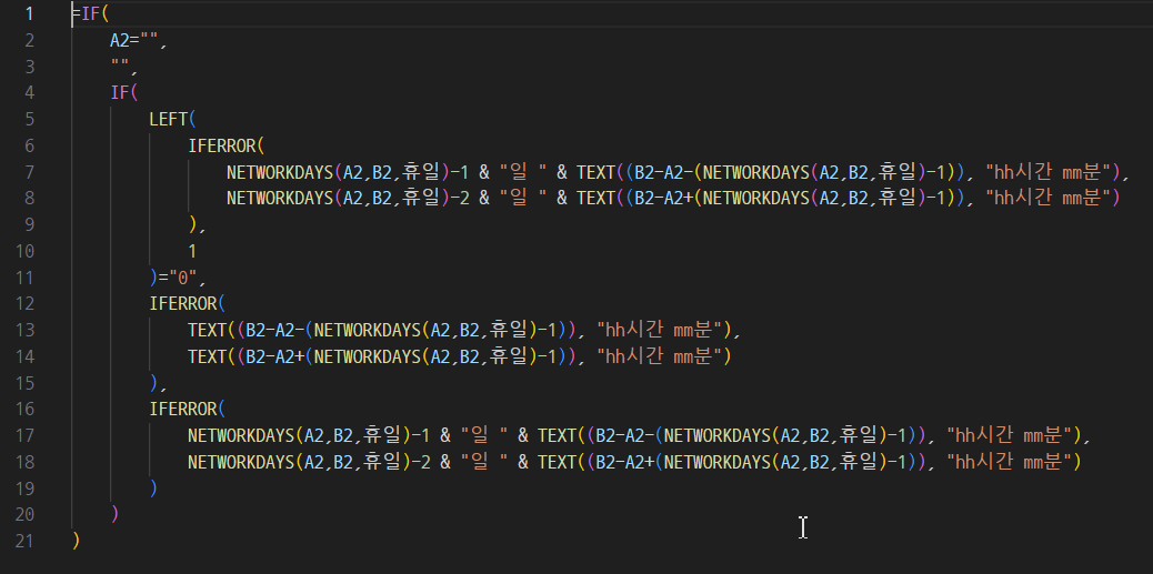 =IF(A2="","", IF(LEFT(IFERROR(NETWORKDAYS(A2,B2,휴일)-1 & "일 " & TEXT((B2-A2-(NETWORKDAYS(A2,B2,휴일)-1)), "hh시간 mm분"), NETWORKDAYS(A2,B2,휴일)-2 & "일 " & TEXT((B2-A2+(NETWORKDAYS(A2,B2,휴일)-1)), "hh시간 mm분")),1)="0", IFERROR(TEXT((B2-A2-(NETWORKDAYS(A2,B2,휴일)-1)), "hh시간 mm분"), TEXT((B2-A2+(NETWORKDAYS(A2,B2,휴일)-1)), "hh시간 mm분")), IFERROR(NETWORKDAYS(A2,B2,휴일)-1 & "일 " & TEXT((B2-A2-(NETWORKDAYS(A2,B2,휴일)-1)), "hh시간 mm분"), NETWORKDAYS(A2,B2,휴일)-2 & "일 " & TEXT((B2-A2+(NETWORKDAYS(A2,B2,휴일)-1)), "hh시간 mm분"))))