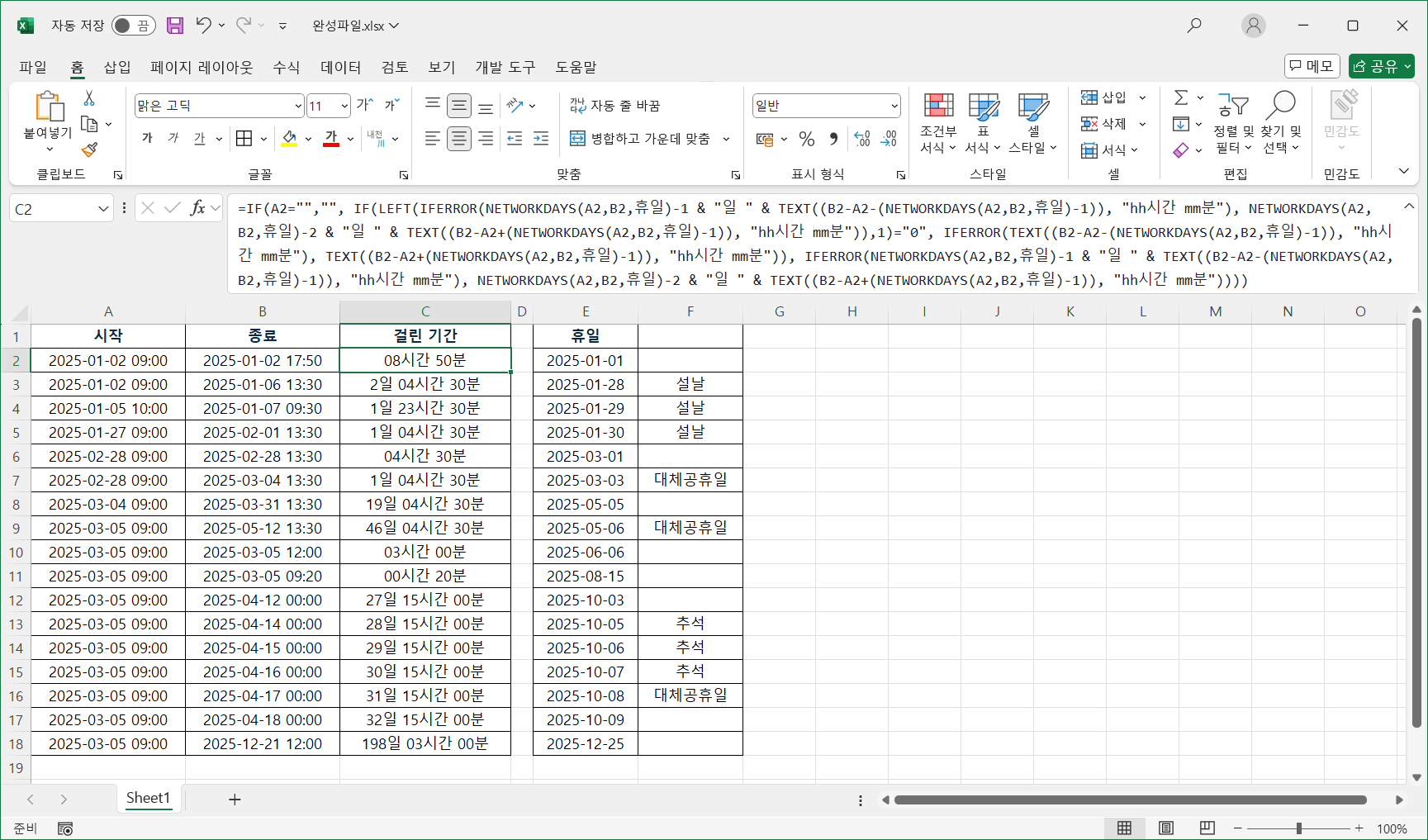 입력된 데이터가 날짜/시간 형식에 맞춰져 있어 간단한 수식과 NETWORKDAYS 함수로 구현되었습니다.