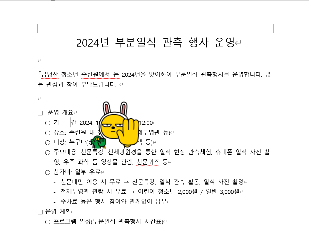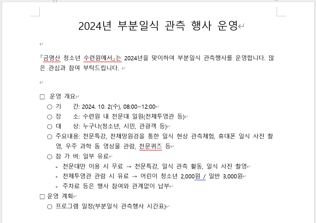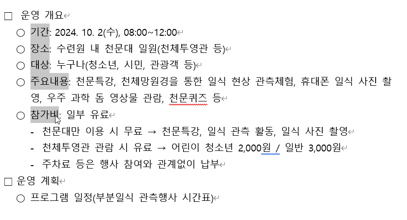 아래 예시에서 '운영 개요' 항목에 해당하는 기간, 장소, 대상, 주요내용, 참가비의 글자 간격을 일일이 띄어 맞췄다면 이제 텍스트 자동 맞춤을 사용해보세요