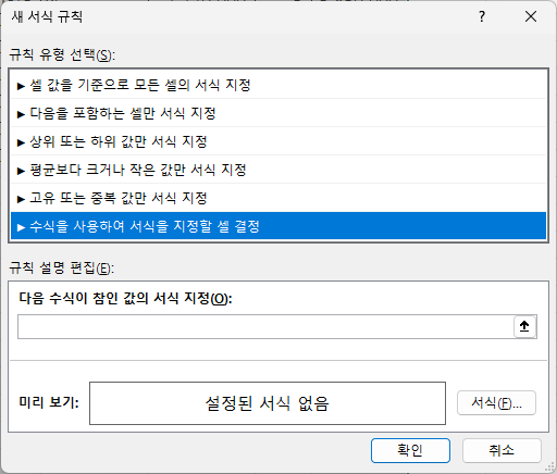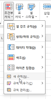 2. [홈] 탭 - [조건부 서식] - [새 규칙] - ‘수식을 사용하여 서식을 지정할 셀 결정’을 선택합니다.