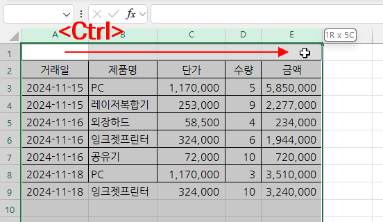 1. 테두리를 적용할 범위를 선택합니다. 이때 1행은 테두리를 적용할 범위가 아니므로 제외합니다. 제외하는 방법은 먼저 [A:E] 열 범위를 선택하고 <Ctrl> 키를 누른상태에서 [A1:E1] 셀을 선택하면 됩니다.