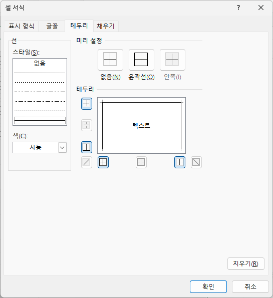 4. [서식] 버튼을 눌러 [테두리] 탭에서 ‘윤곽선’을 선택합니다. 7. 거래일을 입력했더니 테두리가 자동으로 생깁니다.