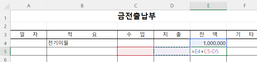 [E5] 셀 수식은 직전 잔액인 [E4] 셀에 [C5] 셀 수입을 더하고, [D4] 셀 지출을 뺀 값입니다.