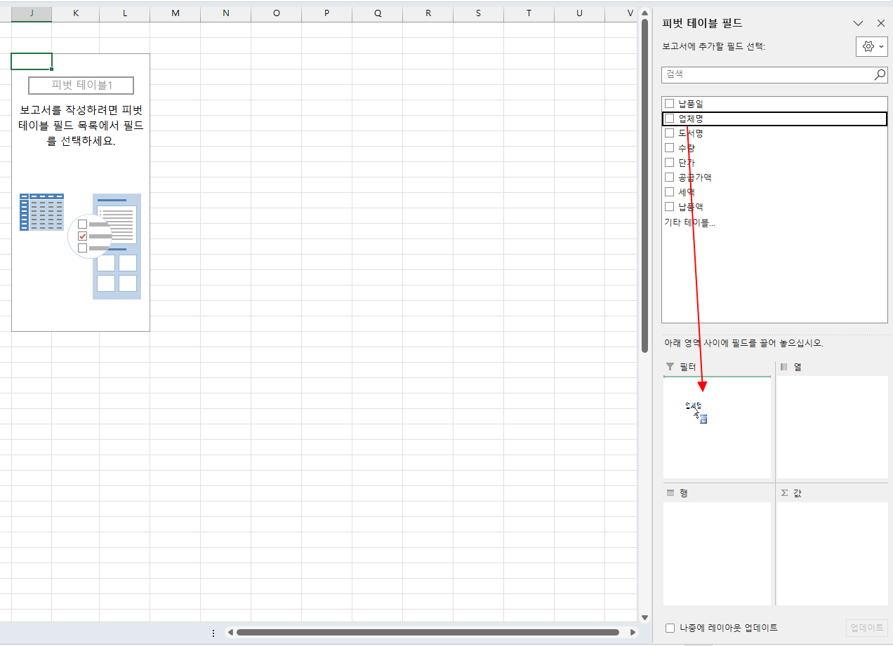 2. 업체명 필드는 필터 항목으로 끌어 놓습니다. 업체별로 시트가 생성되게 하려면 업체명 필드가 필터 영역에 꼭 추가되어야 합니다.